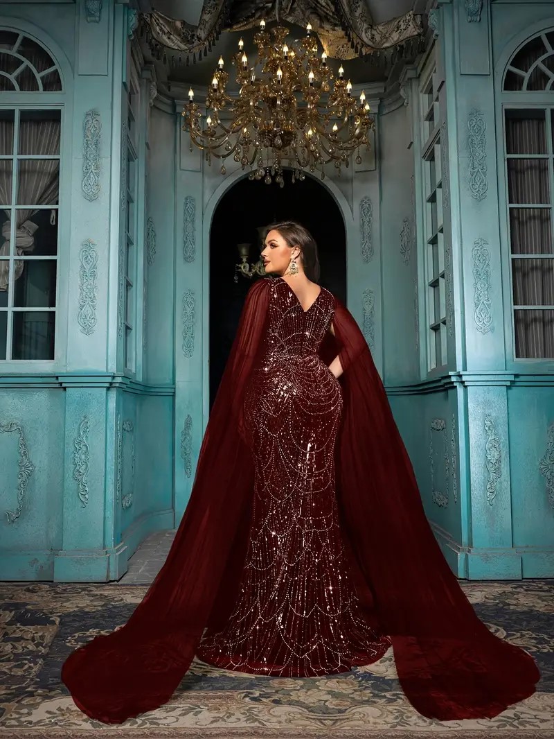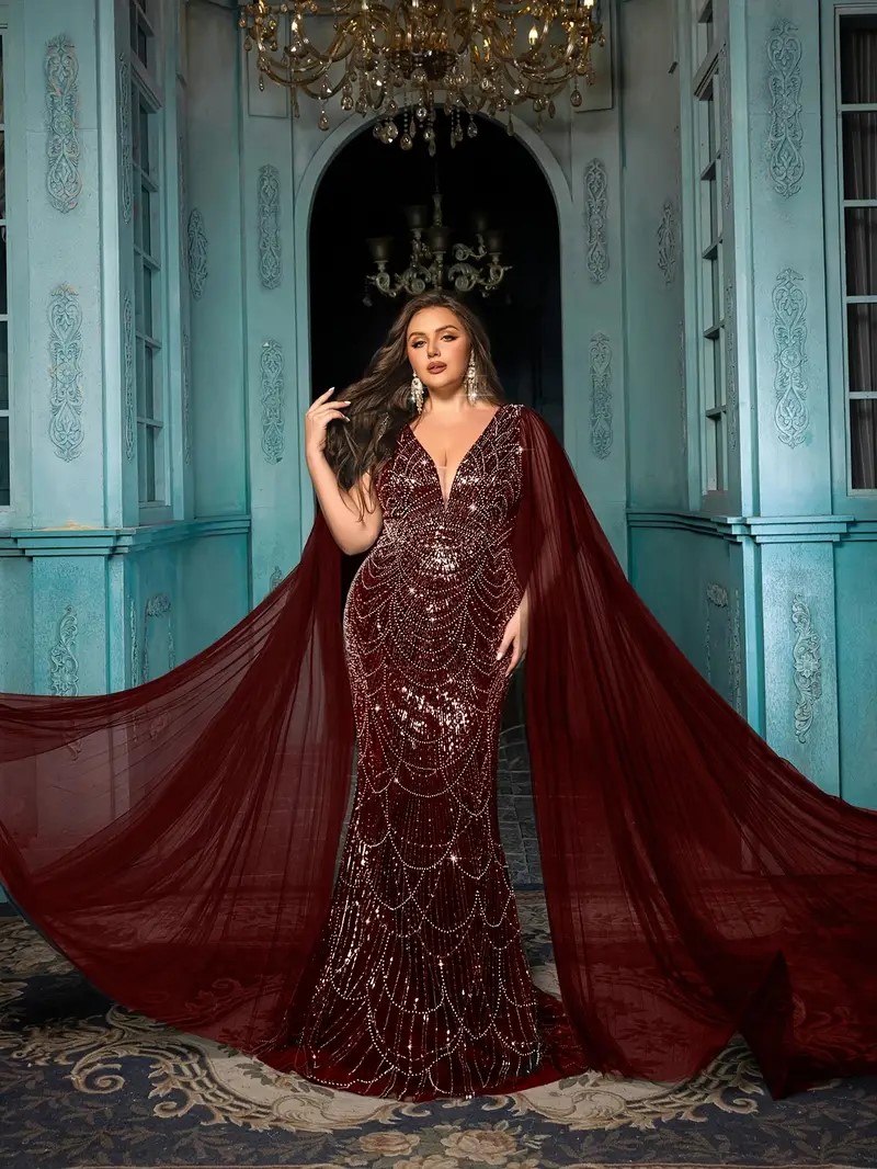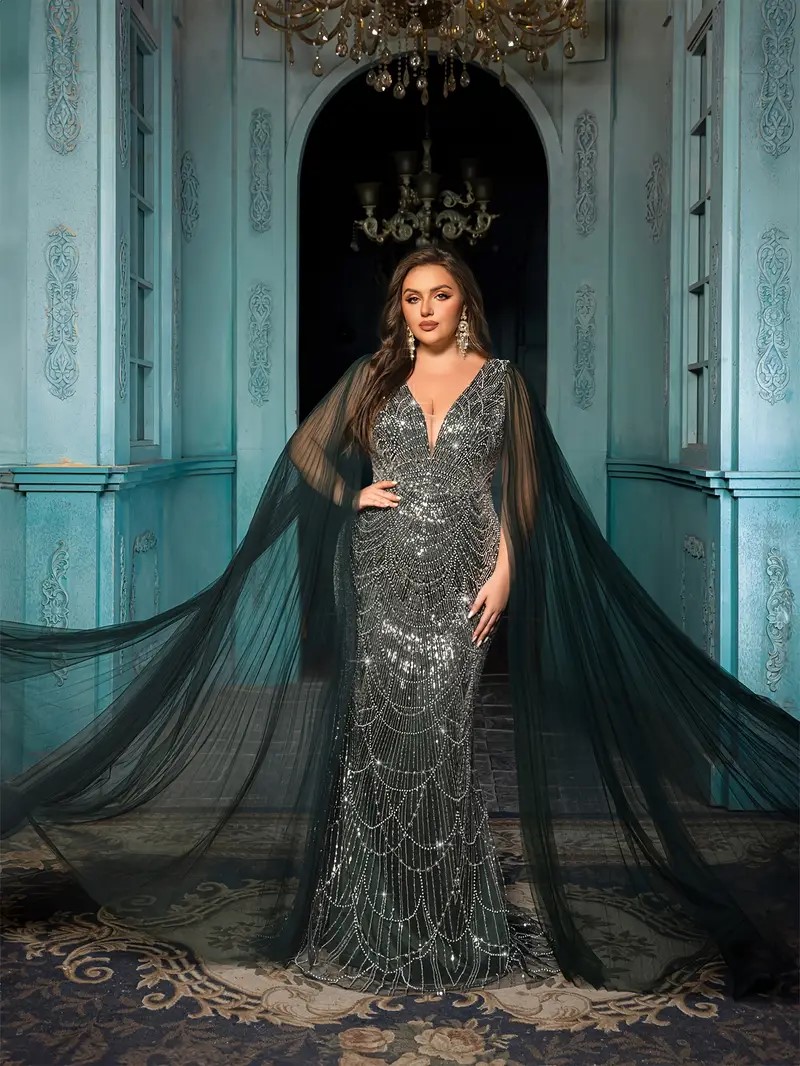 Plus Size Women’s Sequined Mermaid Evening Gown with Long Flowing Mesh Sleeves – V-Neck Formal Prom Dress for Weddings, Graduation & Galas, Mermaid Dress, Galaxy Event Attire, Rhinestone Embellishments.